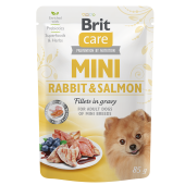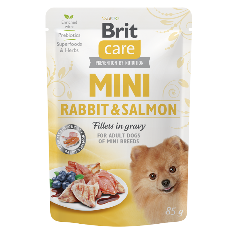 Composition: viande et sous-produits d'origine animale dans les bouchées 45 % (lapin 4 %), poissons et sous-produits de poisson dans les bouchées 35 % (saumon 4 %), jus de viande 9,6 %, plantes et fruits 1,5 % (clou de girofle, agrumes, romarin, curcuma), myrtilles 0,5 %, minéraux 1 %, huile de saumon 1 %, mannane-oligosaccharides 0,5 %, fructo-oligosaccharides 0,5 %, inuline 0,4 %.